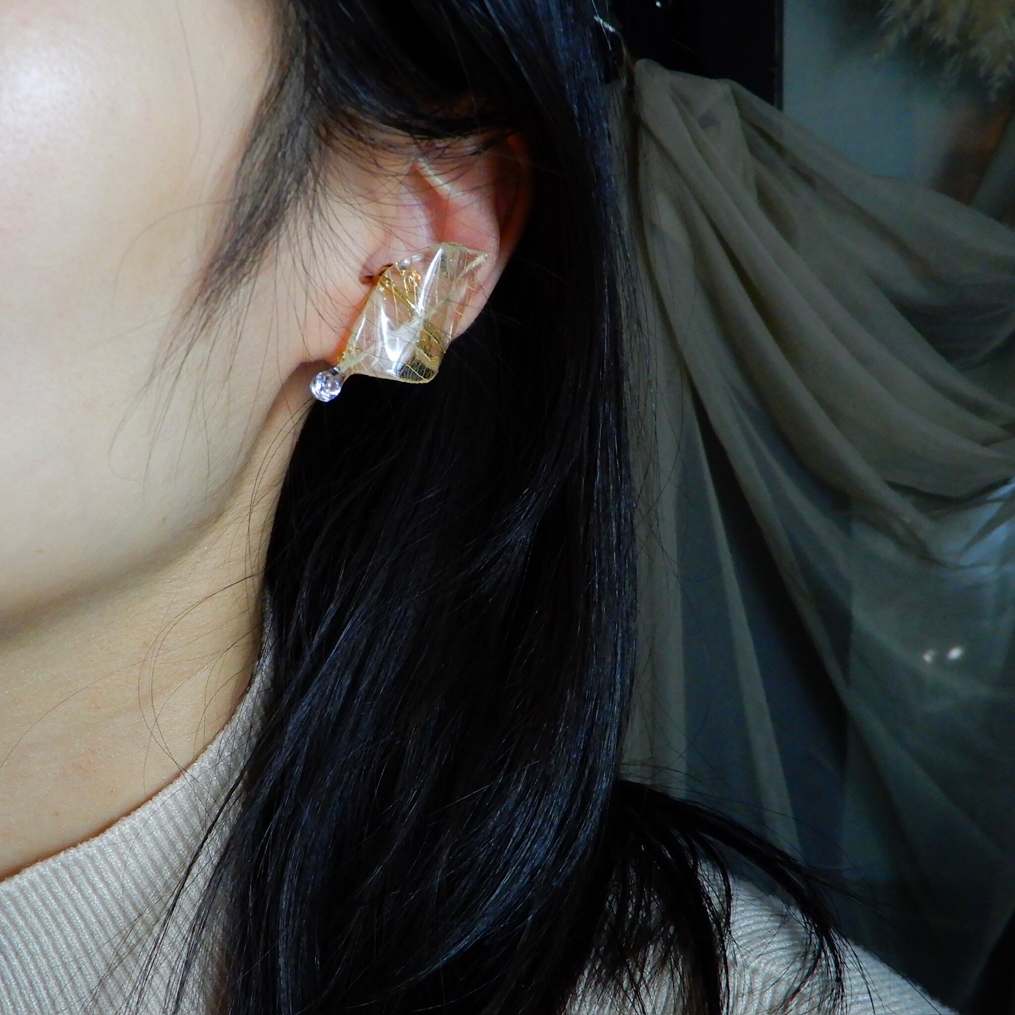 【片耳】雫煌めく朝露リーフ 琥珀✴︎ジルコニアの雫〜2wayイヤーカフ