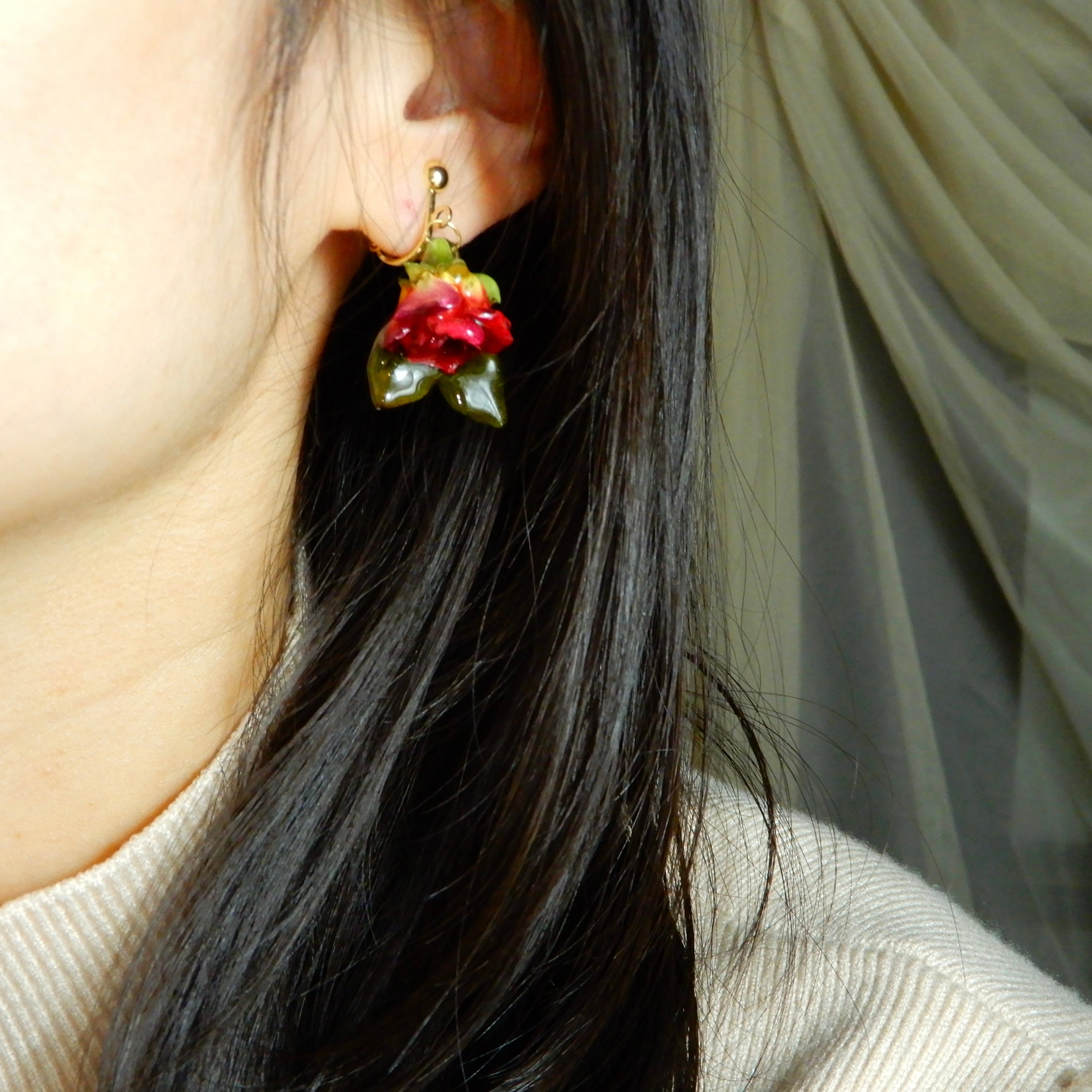 朝露潤う小さな赤薔薇 〜ピアス・イヤリング〜