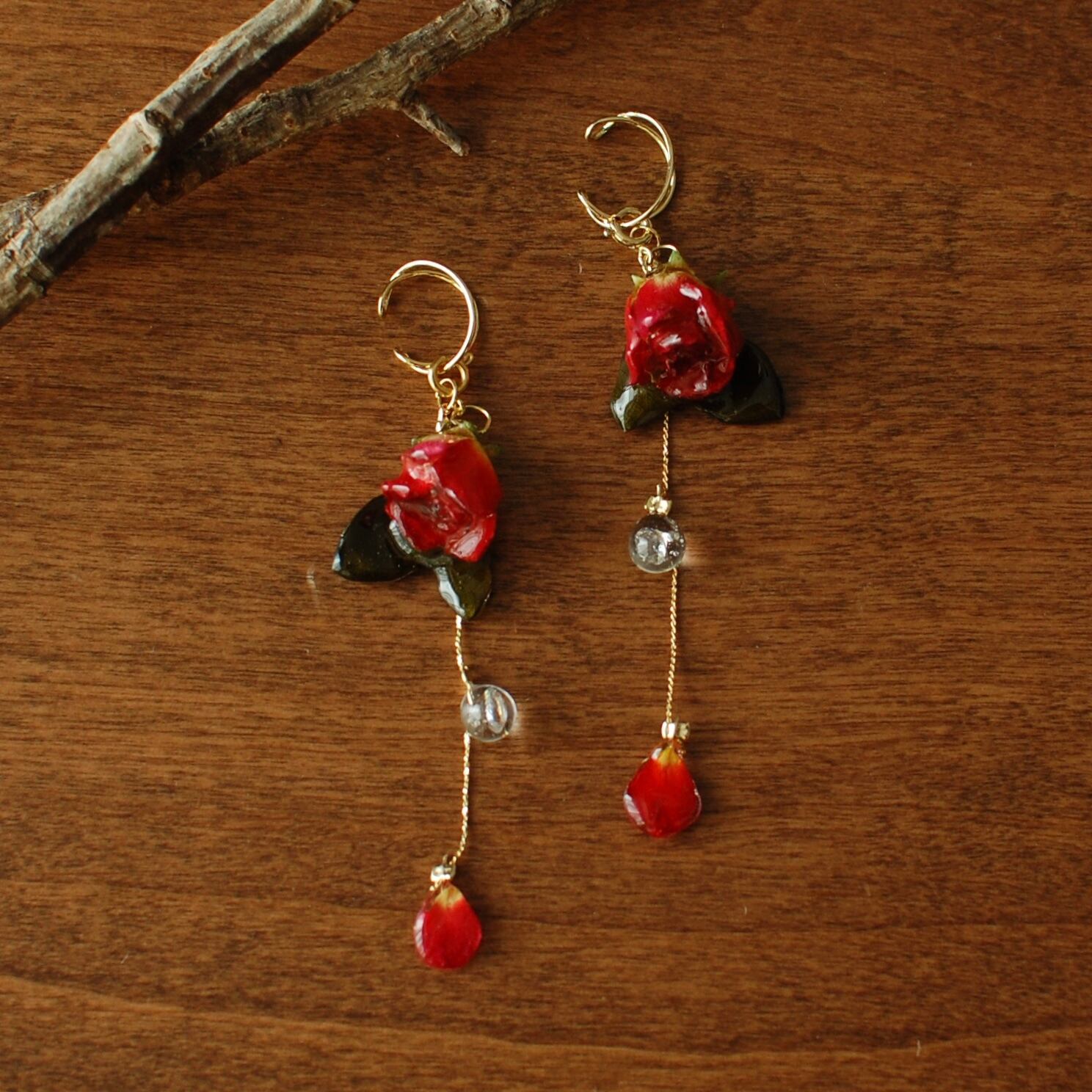 【両耳】2way雫煌めく小さな赤薔薇 〜ピアス・イヤリング〜