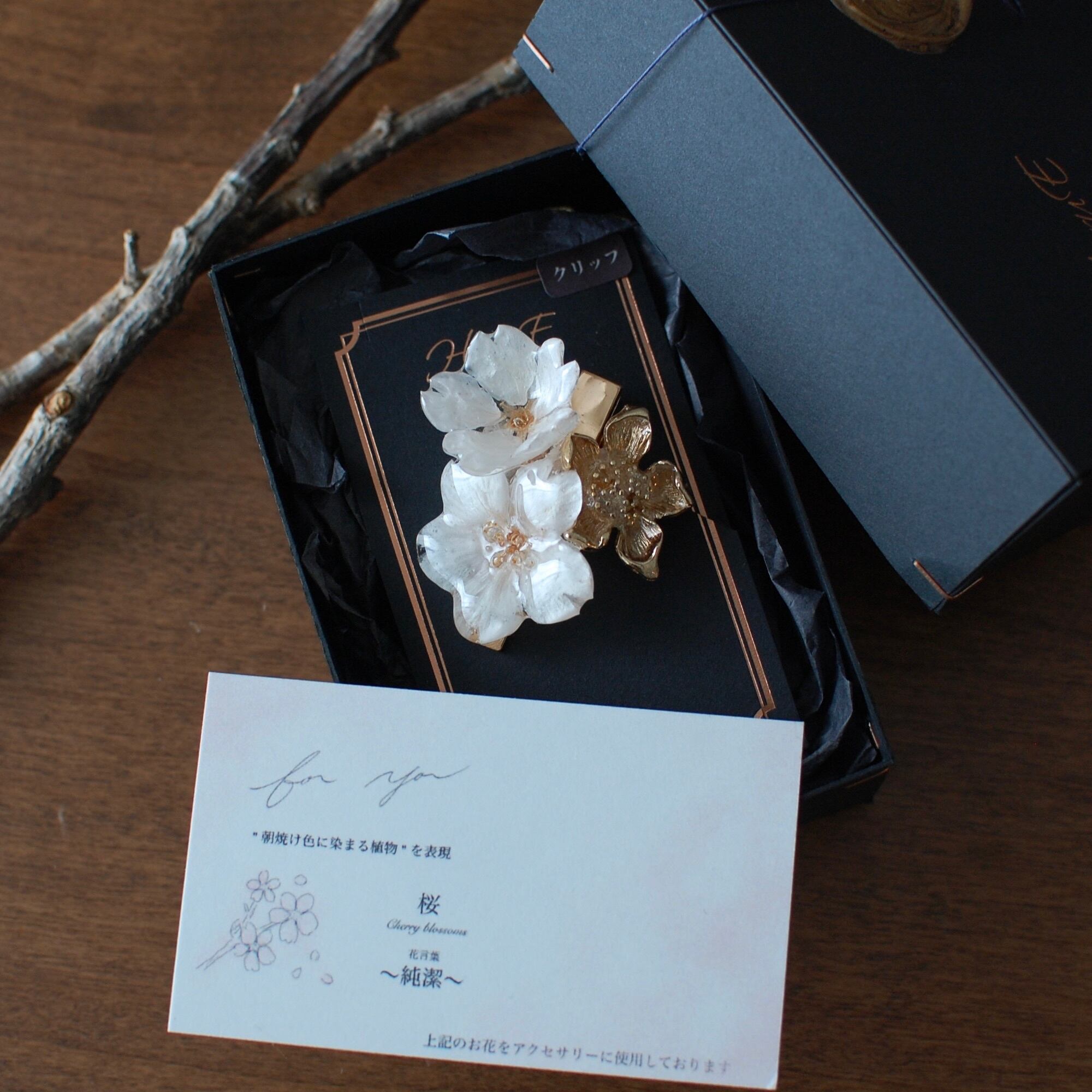 夕陽色に煌めくソメイヨシノ三輪(本物)〜ブローチ・ヘアクリップ・ポニーフック