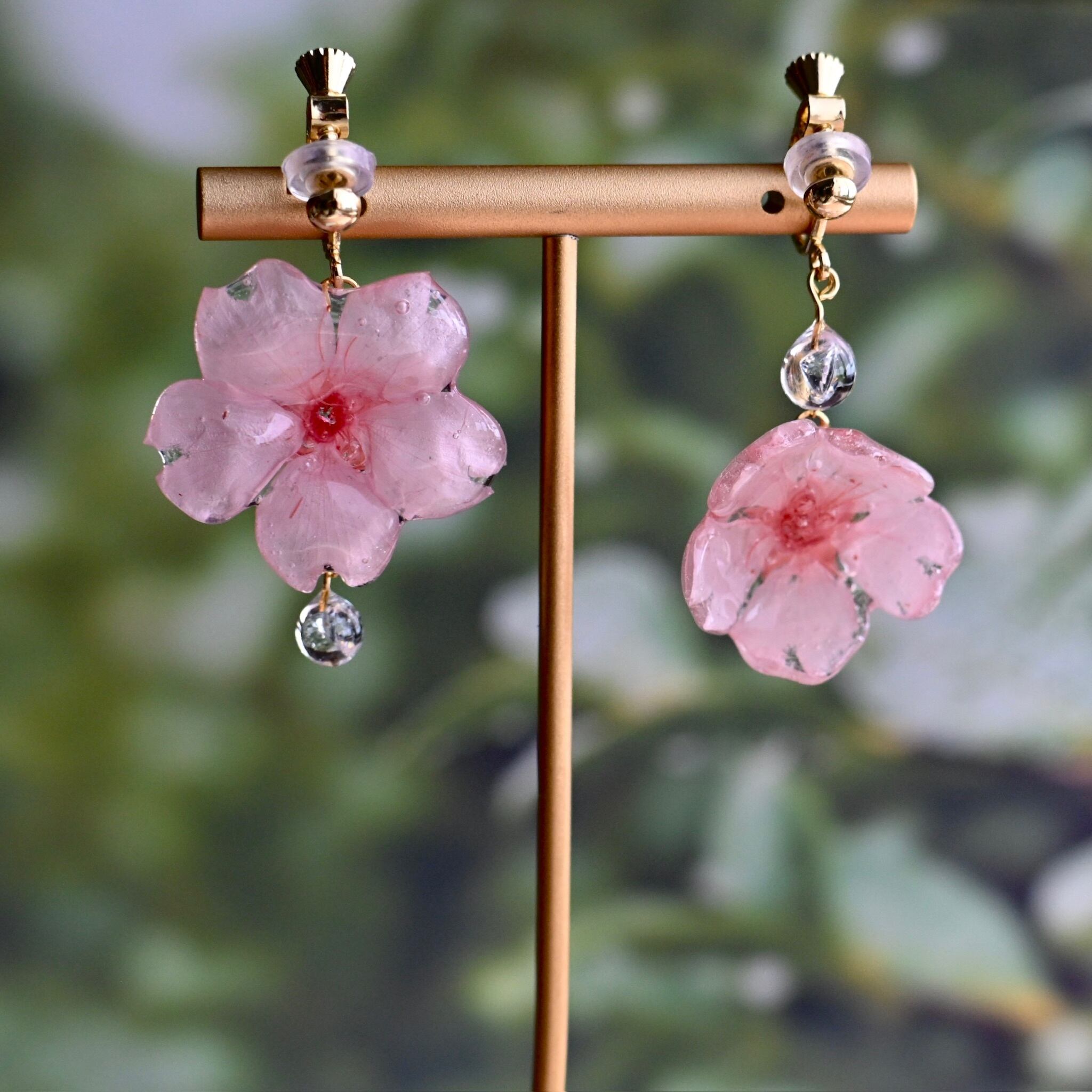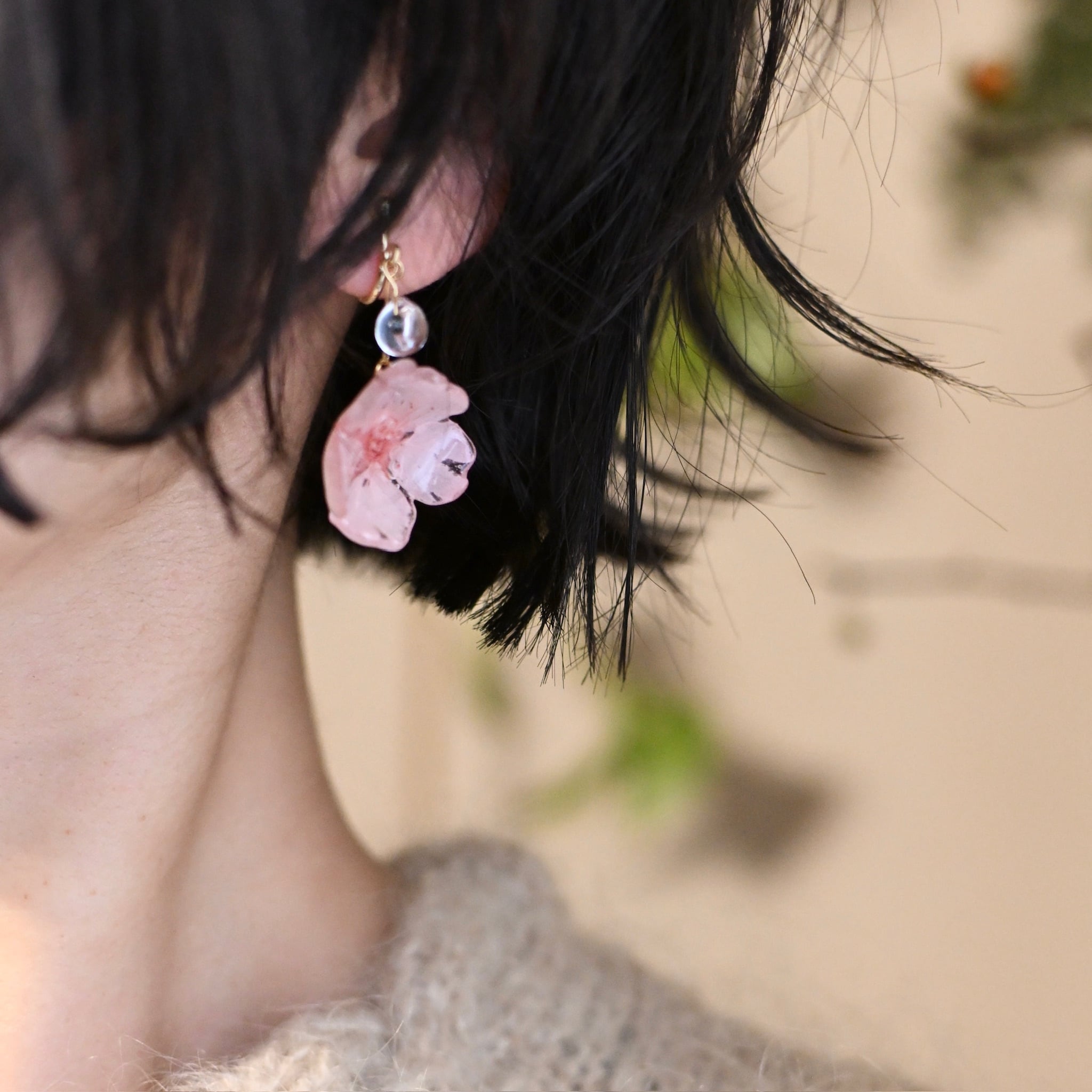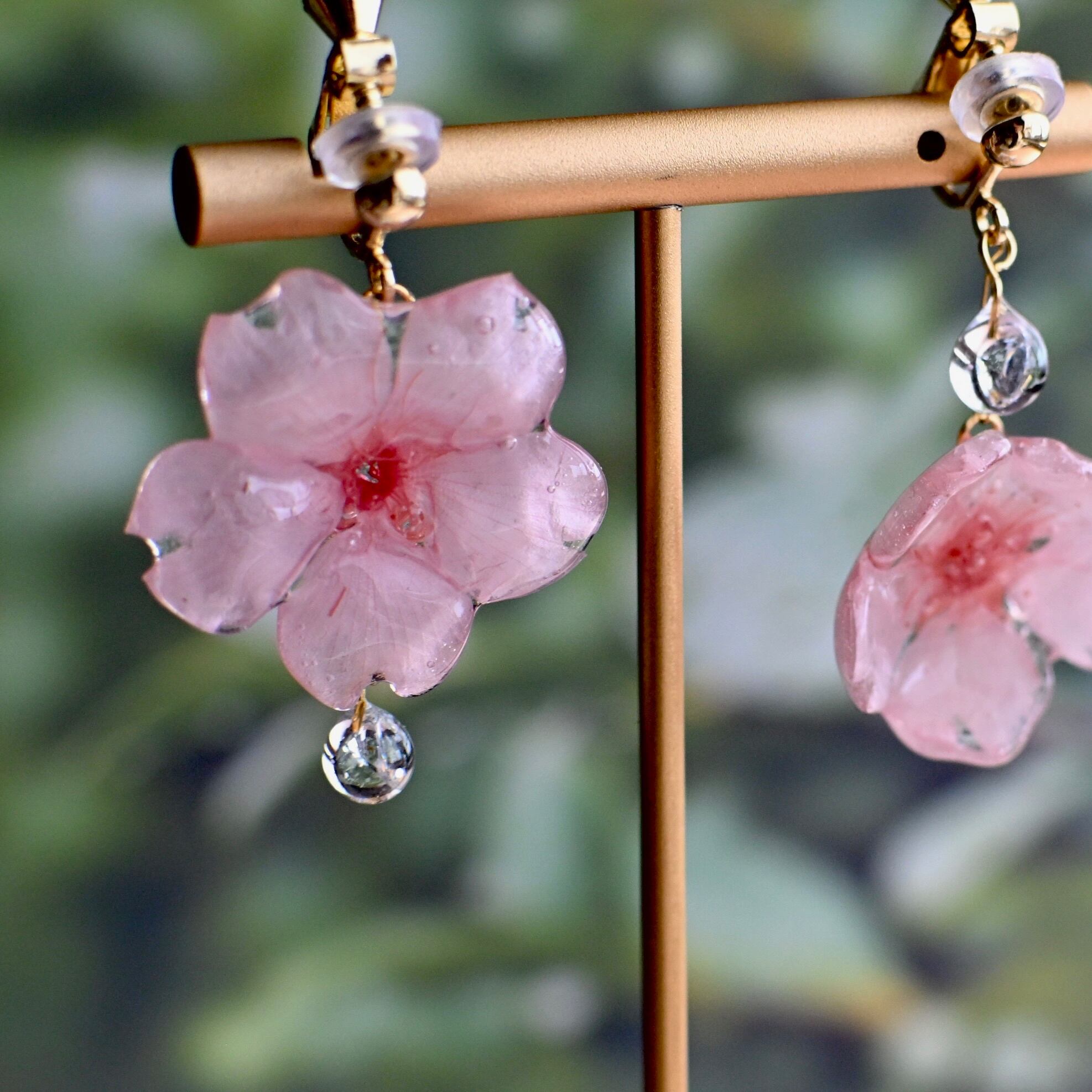 ジルコニアの雫滴る朝露ソメイヨシノ・河津桜色(本物)〜ピアス・イヤリング