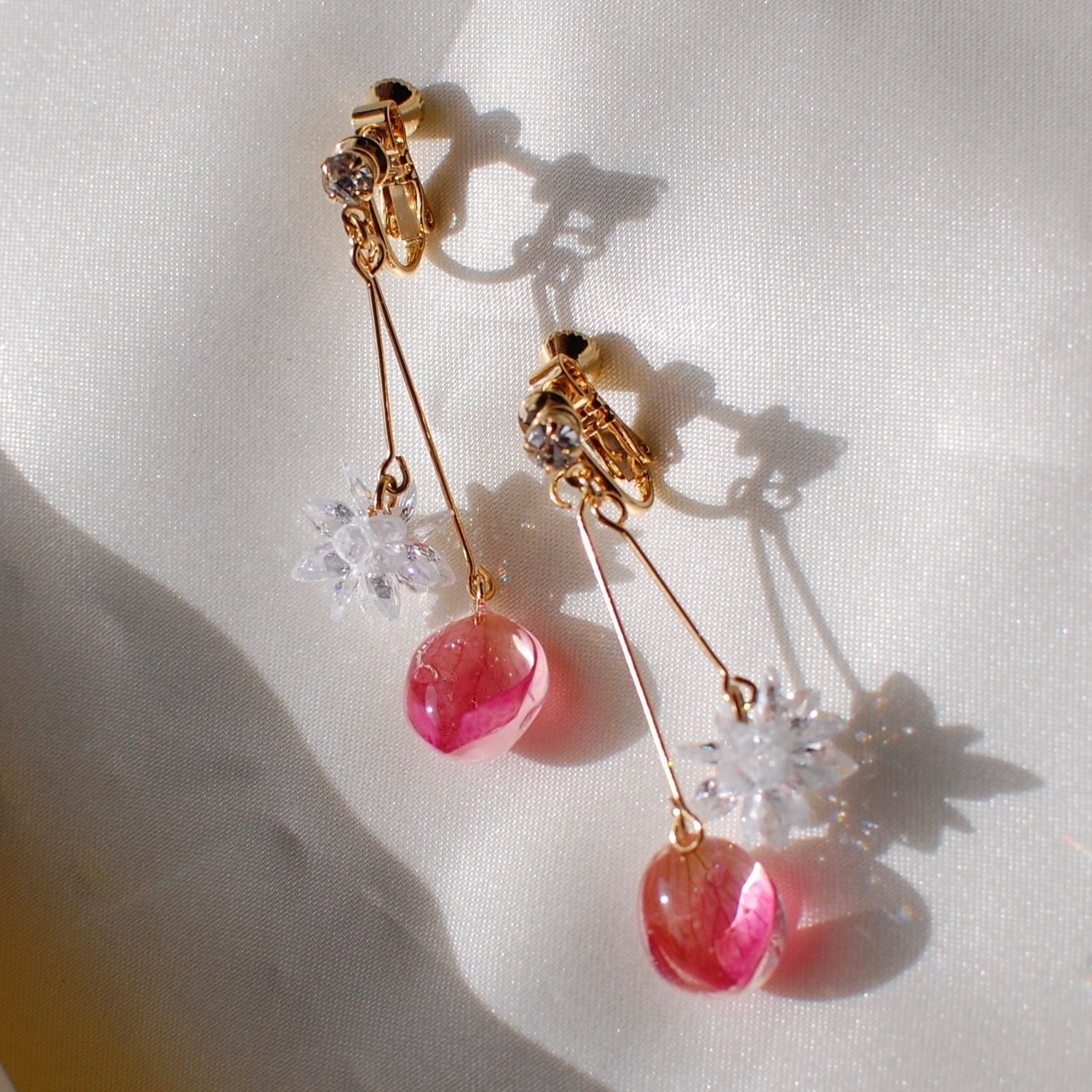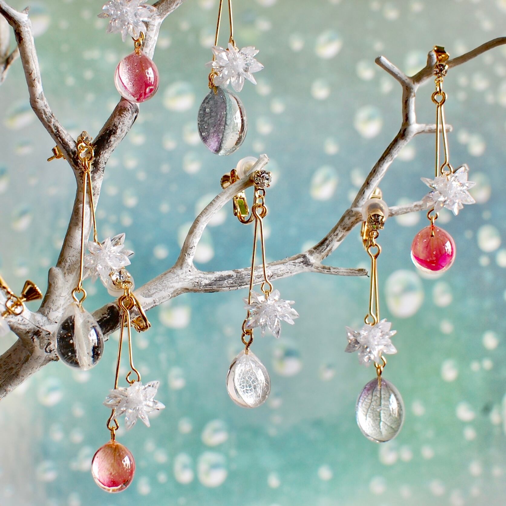 花びらの雫と雪の結晶✴︎ピンク薔薇・ピアス・イヤリング