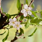 陽の光を浴びて煌めく朝露桜…