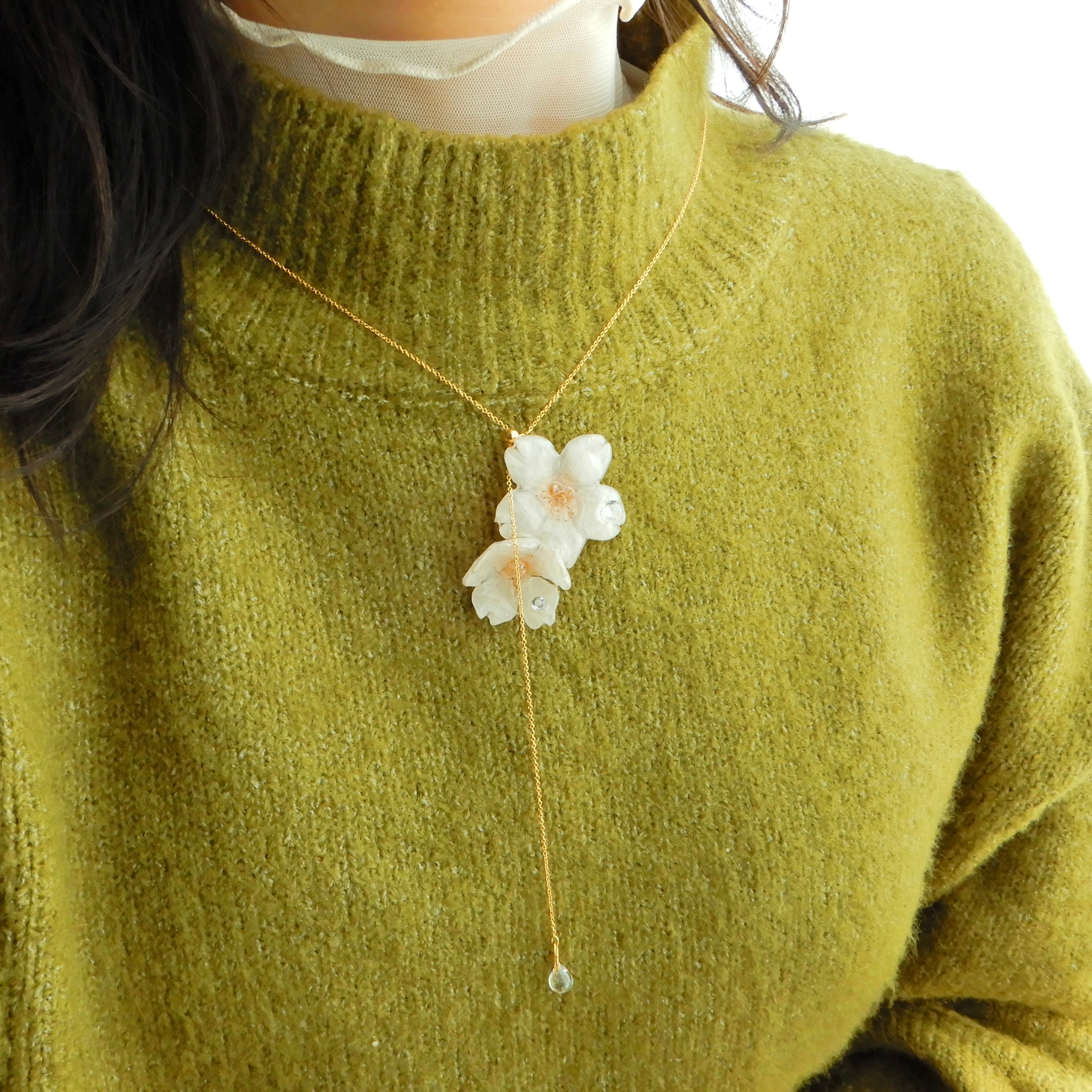 ジルコニアの雫滴る朝露ソメイヨシノ・桜(本物)〜Y字ロングネックレス