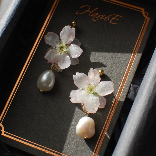 朝露を纏い 今にも落ちそうな雫を震わせ 陽の光を浴びて煌めく朝露桜… を、表現しました✴︎ ・ ・ ・ 柔らかい本物の花びらを樹脂でコーティングし、 艶のあるしっとりとした滑らかな花びらとなりました。 花びらのふちは、厚さを出し、衝撃に強くしています。 雫の中には3ミリのジルコニアを忍ばせ 陽の光に照らされ煌めく雫✴︎を表現しました 雫の中に閉じ込めると、実物よりも大きく見え、 本物の水の中にあるように、滑らかな輝きを放ちます✴︎ 煌めく主張は、石を直に見るよりも控えめで、上品な輝きが特徴✴︎ 桜の優しいほんのりピンクと、 ジルコニアの雫の滑らかな輝きが みずみずしい✴︎上品な一品です。 ✴︎桜の花言葉 ✴︎ " 純潔 " こちらの桜は、啓翁桜を使用しています。 ※本物のお花を使用している為、花のボリューム、バランスが若干異なってきます。お写真はイメージとしてご参考下さい。 ✴︎サイズ 三輪側: 約4.3㎝ 二輪側: 約3.4㎝ ◆金具選択はURLより〈Aパターン〉のものをご覧ください。 → https://harue.official.ec/blog/2023/02/09/194636 【ご購入前に必ずお読みください】 ◆ ラッピング・花言葉カード・配送方法・ご購入時の注意事項について ✴︎こちらのURLをご覧ください。 https://harue.official.ec/blog/2022/12/29/165326 ↓その他の桜の作品はこちら https://harue.official.ec/search?q=桜