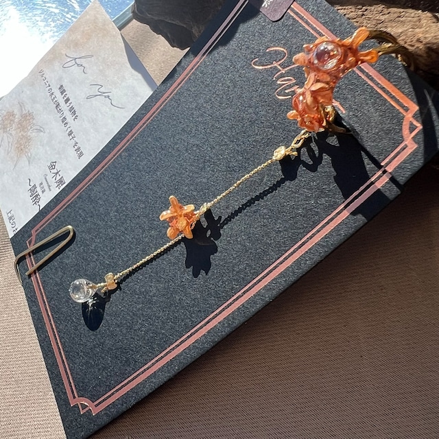 可愛らしく咲く金木犀 潤った花々の間を 水玉がころり… 朝日が昇り 水玉を煌めかせる そんな様子を表現しました✴︎ ・ ・ ・ 本物の金木犀の小さなお花を 一輪一輪、繋ぎ合わせ 金木犀の香りが風の流れに乗って 香ってきそうな… そんな流れるようなデザインに仕上げました✴︎ 雫の中には3ミリと2ミリのジルコニアを忍ばせ 陽の光に照らされ煌めく雫✴︎を表現しました 雫の中に閉じ込めると、実物よりも大きく見え、 本物の水の中にあるように、滑らかな輝きを放ちます✴︎ 煌めく主張は、石を直に見るよりも控えめで、潤いのある上品な輝きが特徴✴︎ 左右の非対称さが、自然のありのままを表現しています。 小さな花々の間を水玉が煌めく… そんな何気ない自然の情景をデザインし、 小さな世界の幸せを表現した一品となりました✴︎ ✴︎金木犀の花言葉 ✴︎ " 陶酔 " ついつい香ってしまう…金木犀の、人々を虜にする香りからついた花言葉✴︎ ※本物の枝を使用している為、ボリューム、バランスが若干異なってきます。お写真はイメージとしてご参考下さい。 ↓金木犀のその他の作品はこちら https://harue.official.ec/search?q=%E9%87%91%E6%9C%A8%E7%8A%80 ✴︎サイズ 2.5㎝前後 ◆金具選択はURLより〈Gパターン〉のものをご覧ください。 → https://harue.official.ec/blog/2023/02/09/194636 【ご購入前に必ずお読みください】 ◆ ラッピング・花言葉カード・配送方法・ご購入時の注意事項について ✴︎こちらのURLをご覧ください。 https://harue.official.ec/blog/2022/12/29/165326
